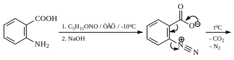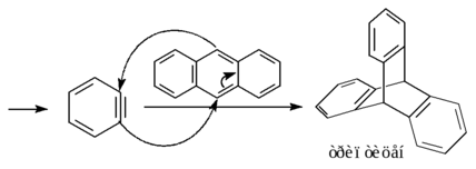 88. Примером реакции, которая может служить доказательством существования дегидробензола в течение короткого времени, является взаимодействие дегидробензола (диенофил) с антраценом или фураном в качестве диена (реакция Дильса-Альдера). Идеальным методом генерирования дегидробензола для этой цели является диазотирование антраниловой кислоты.