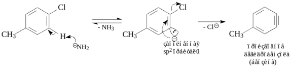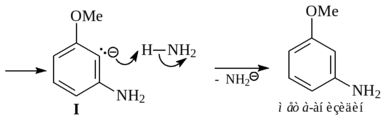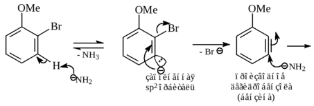 Стерически амид-иону лучше атаковать протон, который находится дальше от метокси-группы, а не рядом с ней. Нуклеофильная атака по тройной связи происходит в плоскости бензольного кольца, т. е. там, где находятся орбитали. Поэтому эта реакция очень чувствительна к стерическому препятствию, если нуклеофил должен атаковать в плоскости заместителя.