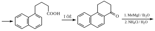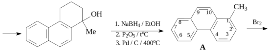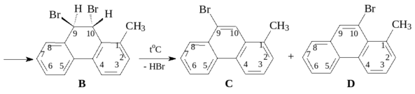 74. Синтез 1-метилфенантрена – (А) из нафталина, иодистого метила и янтарного ангидрида реакцией ацилирования по Фриделю-Крафтсу. Действие брома при низкой температуре в растворе CCl4 на 1-метилфенантрен (А) приводит к преимущественному образованию продукта 9,10-присоединения В (С15Н10Br2), т. е. углерод–углеродная связь С(9)–С(10) проявляет свойства двойной связи. При нагревании дибромпроизводного В выделяется HBr и получаются стабильные ароматические изомерные соединения C и D.