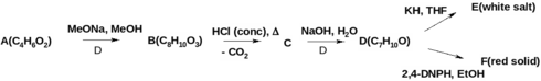 2. Бесцветную жидкость А с резким запахом (широко используемую в производстве эпоксидных смол и фармации) подвергли последовательной обработке метилатом натрия в метаноле, концентрированной соляной кислотой и затем водным раствором гидроксида натрия при нагревании. Выделяемое соединение D бесцветная жидкость. Известно, что D при действии на него гидрида калия в ТГФ без выделения водорода образует солеобразный продукт Е в тоже время с 2,4-динитрофенилгидразином единственным продуктом реакции является тугоплавкий порошок красного цвета. Предложите структуры веществ A,D-F, а также укажите строение промежуточных продуктов B,C. Поясните механизмы превращения A и D. (10 баллов)
