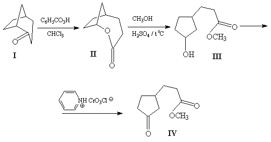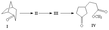 11. Приведите реагенты, с помощью которых можно осуществить трехстадийный синтез соединения (IV). Укажите структуры промежуточных продуктов (II) и (III).
