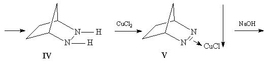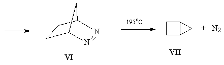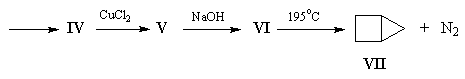 6. Напишите структурные формулы соединений (I)-(VI), принимающих участие в превращениях, приводящих к бицикло[2,1,0]пентану (VII). Соединение (V) представляет собой комплекс одновалентной меди.