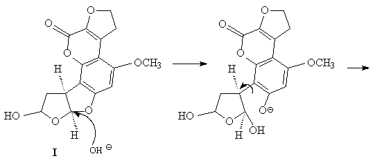 13. Объясните легкую рацемизацию производного афлатоксина В1 (I) в водном растворе в присутствии каталитических количеств щелочи.