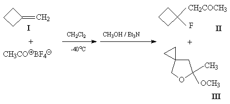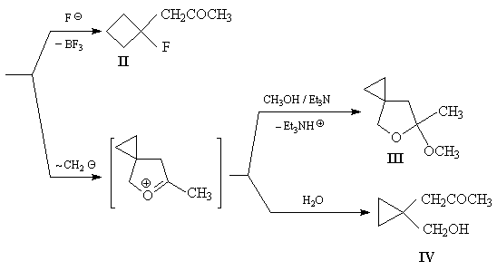 Замена метанола водой приводит к 1-ацетилметил-1-гидроксиметил-циклопропану.(ответ)
