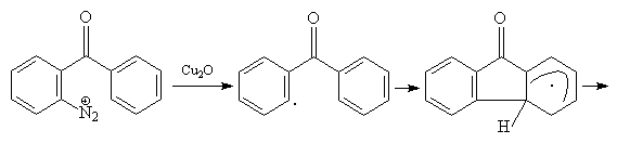 7. Приведите структуру диазосоединения ArN2+HSO4- , нагревание раствора которого в 0.1 М водном растворе H2SO4 в присутствии Cu2О приводит к получению флуоренона с выходом более 90% . Рассмотрите механизм реакции. (ответ)