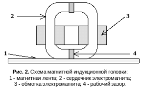 А при воспроизведении записи наблюдается процесс обратный записи: намаг-ниченная лента возбуждает в магнитной головке электрические сигналы, которые после усиления поступают дальше в динамик. (рис. 2)