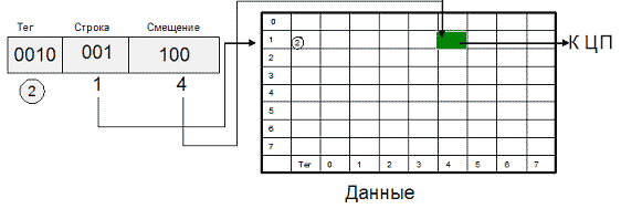 1. Из памяти данных и памяти тэгов кэша одновременно считываются S-ные строки.