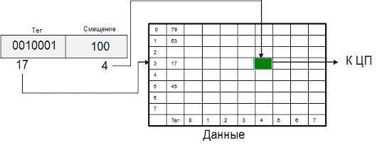 Для полностью ассоциативного кэша характерно, что кэш-контроллер может поместить любой блок оперативной памяти в любую строку кэш-памяти (рис.). В этом случае физический адрес разбивается на две части: смещение в блоке (строке кэша) и номер блока. При помещении блока в кэш номер блока сохраняется в теге соответствующей строки. Когда ЦП обращается к кэшу за необходимым блоком, кэш-промах будет обнаружен только после сравнения тегов всех строк с номером блока.