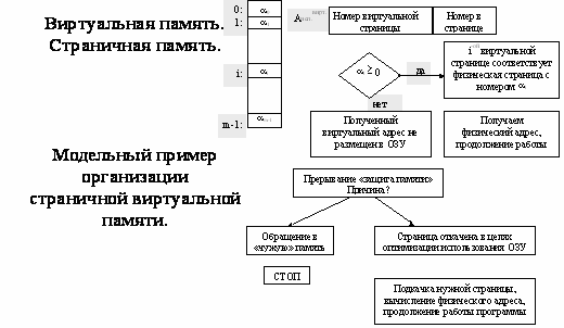 Модельная (упрощенная) схема организации функционирования страничной памяти ЭВМ следующая: Пусть одна система команд ЭВМ позволяет адресовать и использовать m страниц размером 2^k каждая. То есть, виртуальное адресное пространство программы/процесса может использовать для адресации команд и данных до m = 2^r страниц, где r - разрядность поля "номер страницы".