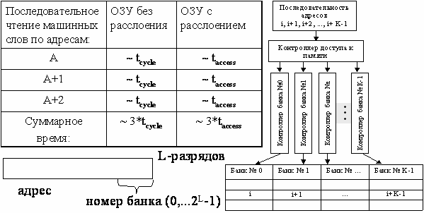 Расслоение ОЗУ – один из аппаратных путей решения проблемы дисбаланса в скорости доступа к данным, размещенным в ОЗУ и производительностью ЦП. Суть расслоения ОЗУ состоит в следующем. Все ОЗУ состоит из k блоков, каждый из которых может работать независимо. Ячейки памяти распределены между блоками таким образом, что у любой ячейки ее соседи размещаются в соседних блоках. Возможность предварительной буферизации при чтении команд/данных. Оптимизация при записи в ОЗУ больших объемов данных.
