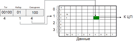 Компромиссным вариантом между первыми двумя алгоритмами является множественный ассоциативный кэш или частично-ассоциативный кэш (рис.). При этом способе организации кэш-памяти строки объединяются в группы, в которые могут входить 2, 4, 8, и т.д. строк. В соответствии с количеством строк в таких группах различают 2-входовый, 4-входовый и т.п. ассоциативный кэш. При обращении к памяти физический адрес разбивается на три части: смещение в блоке (строке кэша), номер группы (набора) и тег. Блок памяти, адрес которого соответствует определенной группе, может быть размещен в любой строке этой группы, и в теге строки размещается соответствующее значение. Очевидно, что в рамках выбранной группы соблюдается принцип ассоциативности. С другой стороны, тот или иной блок может попасть только в строго определенную группу, что перекликается с принципом организации кэша прямого отображения. Для того чтобы процессор смог идентифицировать кэш-промах, ему надо будет проверить теги лишь одной группы (2/4/8/… строк).