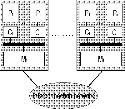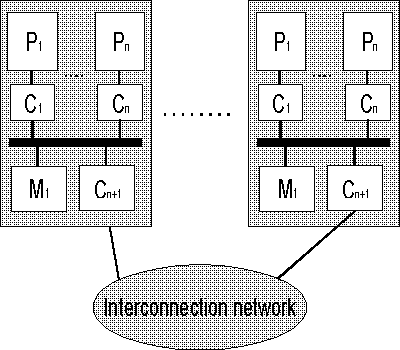 Системы данного класса: SMP (Scalable Parallel Processor, может всё же Symmetric Multiprocessing?) состоят из нескольких однородных процессоров и массива общей памяти (разделяемой памяти – shared memory): любой процессор может обращаться к любому элементу памяти. По этой схеме построены 2,4 процессорные SMP сервера на базе процессоров Intel, НР и т. д., причем процессоры подключены к памяти с помощью общей шины. Системы с большим числом процессоров (но не более 32) подключаются к общей памяти, разделенной на блоки, через не блокирующийся полный коммутатор: crossbar. Любой процессор системы получает данное по произвольному адресу памяти за одинаковое время, такая структура памяти называется: UMA - Uniform Memory Access (Architecture). Пример:НР-9000. Дальнейшее масштабирование (увеличение числа процессоров системы) SMP систем обеспечивается переходом к архитектуре памяти: NUMA - Nоn Uniform Memory Access. По схеме, называемой, этой иногда, кластеризацией SMP, соответствующие блоки памяти двух (или более) серверов соединяются кольцевой связью, обычно по GCI интерфейсу. При запросе данного, расположенного вне локального с сервере диапазона адресов, это данное по кольцевой связи переписывается дублируется в соответствующий блок локальной памяти, ту часть его, которая специально отводится для буферизации глобальных данных и из этого буфера поставляется потребителю. Эта буферизация прозрачна (невидима) пользователю, для которого вся память кластера имеет сквозную нумерацию, и время выборки данных, не локальных в сервере, будет равно времени выборки локальных данных при повторных обращениях к глобальному данному, когда оно уже переписано в буфер. Данный аппарат буферизации есть типичная схема кэш памяти. Так как к данным возможно обращение из любого процессора кластера, то буферизация, размножение данных требует обеспечение их когерентности. Когерентность данных состоит в том, что при изменении данного все его потребители должны получать это значение. Проблема когерентности усложняется дублированием данных еще и в процессорных кэшах системы. Системы, в которых обеспечена когерентность данных, буферизуемых в кэшах, называются кэш когерентными (cc-cache coherent), а архитектура памяти описываемого кластера: cc- NUMA (cache coherent Nоn Uniform Memory Access). Классической архитектурой принято считать систему SPP1000.