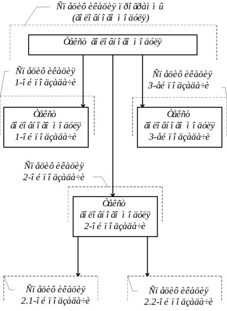 Конструктивный подход к разработке программы представляет собой модификацию нисходящей разработки, при которой модульная древовидная структура программы формируется в процессе программирования модулей. Разработка программы при конструктивном подходе начинается с программирования головного модуля, исходя из спецификации программы в целом. При этом спецификация программы принимается в качестве спецификации ее головного модуля, который полностью берет на себя ответственность за выполнение функций программы. В процессе программирования головного модуля, в случае, если эта программа достаточно большая, выделяются подзадачи (внутренние функции), в терминах которых программируется головной модуль. Это означает, что для каждой выделяемой подзадачи (функции) создается спецификация реализующего ее фрагмента программы, который в дальнейшем может быть представлен некоторым поддеревом модулей. Важно заметить, что здесь также ответственность за выполнение выделенной функции несет головной (может быть, и единственный) модуль этого поддерева, так что спецификация выделенной функции является одновременно и спецификацией головного модуля этого поддерева. В головном модуле программы для обращения к выделенной функции строится обращение к головному модулю указанного поддерева в соответствии с созданной его спецификацией. Таким образом, на первом шаге разработки программы (при программировании ее головного модуля) формируется верхняя начальная часть дерева, например, такая, которая показана на рис. 7.1.