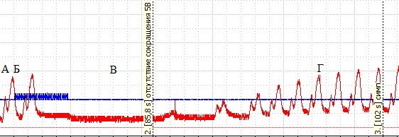 Рис. 3. Механограмма градаций СС в норме (А), при стимуляции вазо-симпатического пучка с амплитудой стимула 5 В (Б), остановке сердца (В) и симпатическом эффекте (Г).