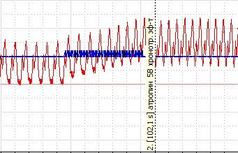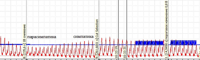 Далее на стимуляторе была установлена частота 20 Гц, длительность — 0,5 мс, напряжение 3 В. При включении стимуляции на 5 с с амплитудой стимуляции 5 В наблюдалась остановка сердцебиения (-100% от исходной амплитды), что является результатом отрицательного инотропного эффекта. Восстановление сердцебиения происходит сначала под действием симпатического эффекта, а затем парасимпатического. Это обусловлено тем, что симпатический эффект сохраняется дольше, количество норадреналина в синаптической щели снижается медленнее, чем количество медиатора парасимпатической регуляции — адреналина.