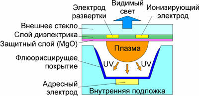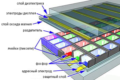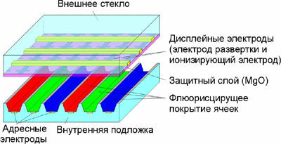 Плазменная панель представляет собой матрицу газонаполненных ячеек, заключенных между двумя параллельными стеклянными пластинами, внутри которых расположены прозрачные электроды, образующие соответственно шины сканирования, подсветки и адресации. Разряд в газе протекает между разрядными электродами (сканирования и подсветки) на лицевой стороне экрана и электродом адресации на задней стороне.