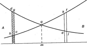 Общую идею своей теории обмена Джевонс поясняет на следующем графике (рис.1). По горизонтальной оси откладываются количества обмениваемых товаров, например, зерна и мяса, причем количество зерна возрастает слева направо, а количество мяса - справа налево. По вертикальной оси откладывается предельная полезность обоих товаров (естественно, предельная полезность зерна убывает слева направо, а мяса — справа налево). Предположим, что до обмена у торгующей стороны А было а единиц мяса, а у торгующей стороны В — Ь единиц зерна. Обменивая некоторое количество своего мяса на зерно, А сдвигается из точки а в точку d (для удобства предполагается, что обмениваемые количества зерна и мяса измеряются одинаковыми горизонтальными отрезками). При этом для него полезность приобретеннного зерна составит adgd, а полезность отданного мяса — всего adch, так что чистый прирост полезности от обмена составит величину, равную площади hdgc. Очевидно, что в интересах А будет продолжать обмен, пока он не придет в точку т. То же самое со своей стороны проделает и владелец зерна В.