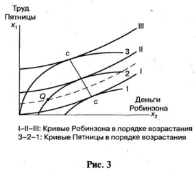 Эджуорт рассматривает случай изолированного обмена (рис. 3): на необитаемом острове Пятница предлагает Робинзону свой труд (х2) в обмен на деньги (*,). (Оттого, что будет Пятница делать с деньгами на необитаемом острове, Эджуорт абстрагируется.) Количества денег и труда откладываются соответственно на осях абсцисс и ординат (см. рис. 3). Для обоих участников обмена кривые безразличия: 3, 2, I - для Пятницы, I, II, III - для Робинзона являются возрастающими, так как чем больше своего ресурса они отдадут, тем больше по-