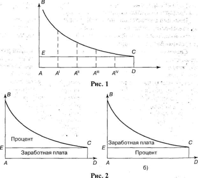 тор», который Кларк условно называет «капиталом» ) и будем последовательно увеличивать количество работников на единицу6 до тех пор, пока не исчерпаем всю рабочую силу в данной стране. В результате получим ту же картину убывающей отдачи или «падения конечной производительности труда». Площадь под этой падающей кривой ABCD (рис.1) представляет собой весь продукт труда, оснащенного «капиталом». В то же время поскольку все приращения труда равноценны по качеству, то в силу конкуренции нанимателей между собой и работников между собой заработная плата или «продукт труда самого по себе», как уже отмечалось, будет тяготеть к конечному (предельному) продукту труда. Она измеряется площадью прямоугольника (AECD), сторонами которого являются количество единиц труда и предельный продукт труда. Площадь ЕВС в данном случае представляет собой «рентный доход капитала», т.е. процент (рис. 2а).