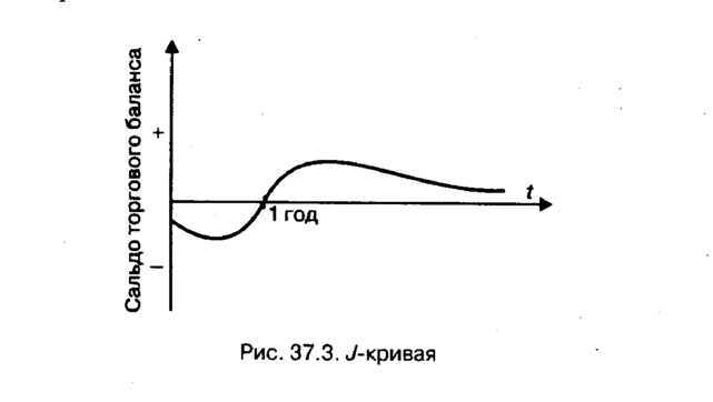 На рис. 37.3 изображена схематичная кривая, отражающая, как в теории торговый баланс и баланс по текущим операциям реагируют на падение курса национальной валюты. Кривая носит название «J-кривая».