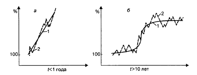 Рис. 37.2. Соотношение ППС двух валют и валютный курс в условиях высоких темпов инфляции в одной из стран (а) и за длительный период времени (б): 1 — динамика соотношения ППС; 2— динамика валютного курса