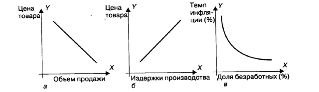 Если линия графика идет слева направо по нисходящей, то между двумя переменными существует обратная связь (так, по мере снижения цен на товар обычно растет объем его продажи — рис. 1,а). Если линия графика идет по восходящей, то связь прямая (так, по мере роста издержек производства товара обычно растут цены на него — рис. 1,6). Зависимость может быть нелинейной (т.е. изменяющейся), тогда график приобретает форму кривой линии (так, по мере уменьшения инфляции безработица имеет тенденцию к увеличению — кривая Филлипса, рис.1,в).
