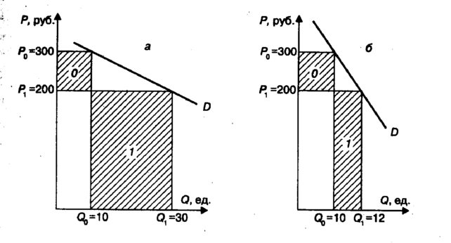 На рис. 9.1 изображены два варианта графиков спроса. На рис. 9.1,а снижение цены с Р0 до Р1 на 100 руб. (на 33%) приведет к росту величины спроса с Q0 до Q1 на 20 ед. (на 200%). Коэффициент эластичности будет равен 6 (200:33), т.е. он больше 1, и спрос эластичен. А что произойдет с выручкой от реализации продукции? Она увеличится с 3000 (300 · 10) до 6000 руб. (200 · 30), т.е. вырастет в два раза. Заштрихованные прямоугольники 0 и 7 наглядно показывают увеличение выручки от реализации продукции при снижении цены в условиях эластичного спроса. Площадь прямоугольника 1 заметно больше площади прямоугольника 0.
