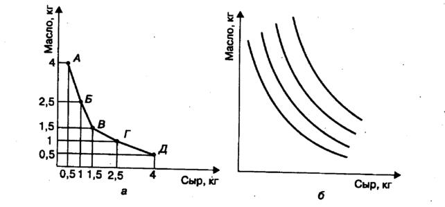 Исходя из норм замещения можно определить, является ли один товар ради относительно другого более или менее значительным для потребителя и насколько он готов отказаться от одного товара ради увеличения потребления другого. На рис. 9.7 показаны предпочтения потребителей А и Б в отношении масла и сыра: А отдает предпочтение маслу, в то время как Б — сыру.