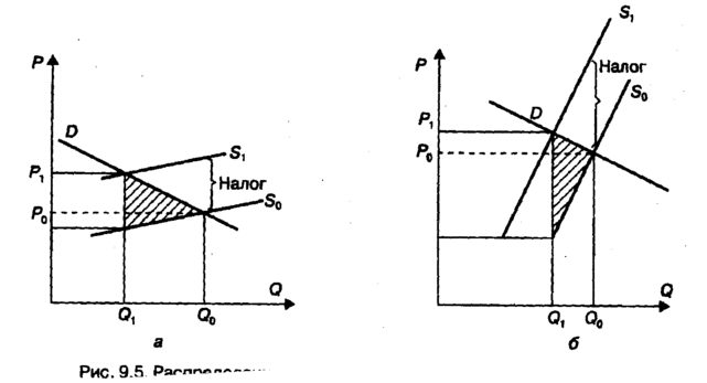 Рис. 9.5. Распределение налогового бремени при эластичном (а) и неэластичном (б) предложении: D — спрос;S0,S1) — предложение до и после введения налога