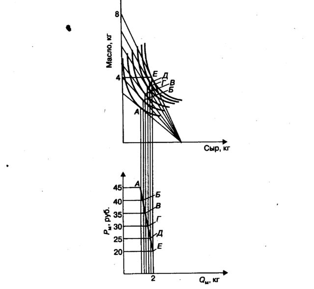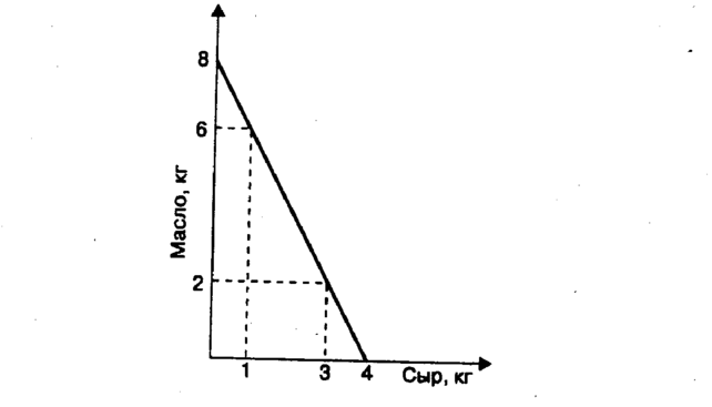 Мы можем купить 6 кг масла и 1 кг сыра (6 · 20 + 1 · 40), а также 2 кг масла и 3 кг сыра (2·20 + 3 · 40) и т.д. При любом возможном сочетании на прямой количеств закупок этих двух продуктов мы потратили весь свой доход в 160 руб. Иными словами, мы можем выбрать любое сочетание количеств масла и сыра, однако какое же конкретно мы выберем?