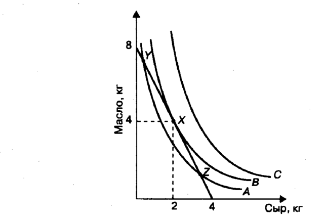 Чтобы ответить на вопрос, как обеспечить максимальное удовлетворение от покупки при ограниченном бюджете, мы должны знать, какой из наборов продуктов предпочтем. Наши предпочтения выражаются через кривые безразличия. Вопрос в том, какую точку на кривой безразличия мы выберем. Эта точка должна быть точкой пересечения кривой безразличия и бюджетной линии. Очевидно, это будет точка Х на рис. 9.9. Мы не выберем ни точку Y, ни точку Z, ибо они лежат на кривой безразличия А, находящейся ниже кривой безразличия В, а потому приносят меньше удовлетворения; с кривой безразличия С бюджетная линия не имеет общих точек. Поэтому можно сделать вывод, что в своем выборе мы остановимся на точке, где бюджетная линия является касательной к кривой безразличия, т.е. мы купим 4 кг масла и 2 кг сыра.