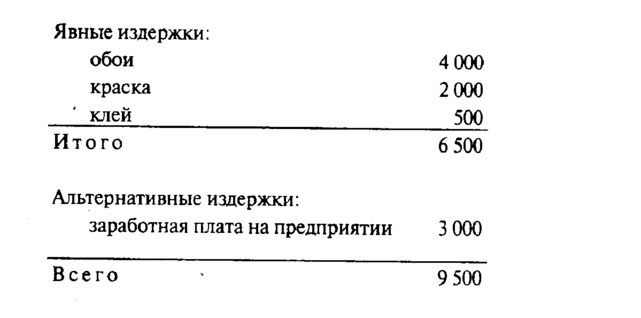 Пример 10.1. Вы решили самостоятельно отремонтировать свою квартиру. Вашими затратами будет стоимость обоев, краски, клея и т.п. Однако, ремонтируя квартиру несколько дней, вы отказываетесь от другой работы, где могли бы получать заработную плату (например, взяли на работе отпуск за свой счет). Структура ваших издержек будет выглядеть следующим образом, руб.: