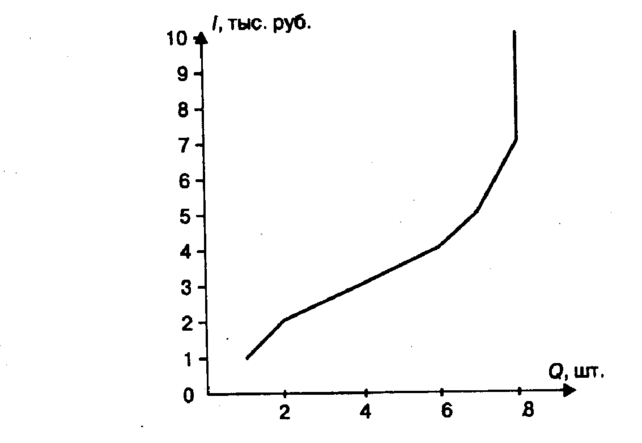 Как видно, при росте дохода с 1 тыс. до 2 тыс. руб. в месяц 1 объем покупок возрастает с 1 до 2 шт., с 2 тыс. до 3 тыс. руб. — с 2 до 4 шт. При дальнейшем увеличении доходов темп роста покупок товара замедляется: с 3 тыс. до 4 тыс. руб. — с 4 до 6 шт., с 4 тыс. до 5 тыс. руб. — с 6 до 7 шт., а затем и совсем прекращается (при доходе свыше 7 тыс. руб. в месяц покупается 8 шт. данного товара).
