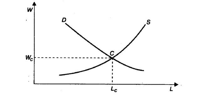 Равновесная ставка заработной платы и равновесный уровень занятости данного вида труда определяются на пересечении кривых предложения и спроса на труд (в точке С).