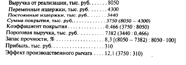 Как видно, в результате обновления ассортимента положение фирмы улучшилось: прибыль выросла с 310 тыс. до 790 тыс. руб., запас прочности увеличился с 8,3 до 18,6%, эффект производственного рычага снизился с 12,1 до 5,35.