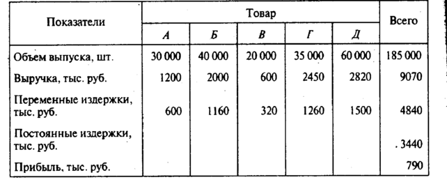 4. Фирма производит 200 тыс. шт. товара А и 400 тыс. шт. товара Б. Ниже приведены цена реализации и затраты на производство каждого из этих товаров, руб.: