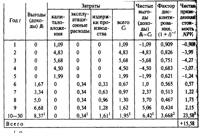 Для иллюстрации расчета приведем взятый из практики Всемирного банка реальный ирригационный проект с циклом жизни 30 лет и со ставкой дисконта 10%.