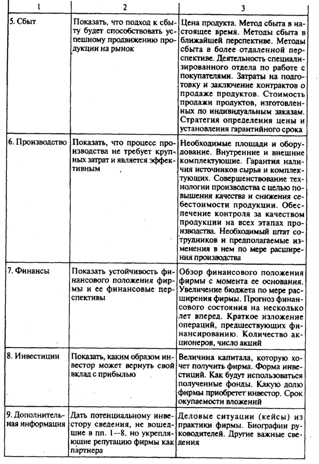 • с описательной точки зрения быть кратким, простым и понятным, чтобы потенциальный инвестор мог быстро разобраться в сути предложения и оценить его привлекательность. Это требование в первую очередь относится к резюме и предпосылкам, на основании которых строится прогноз основных показателей: реализации, параметров внешней среды и т.д.;