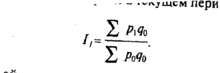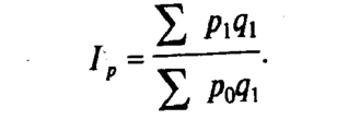 сли нам надо рассчитать соотношения цен по набору товаров, то выбор и расчет соответствующих показателей (индексов) усложнится. В этом случае надо вначале определить, каков состав набора товаров и как рассчитать средние цены, ибо с изменением структуры реализуемых товаров изменятся их доли (веса) в наборе, а затем избрать наиболее приемлемый метод подсчета ценовых индексов (от метода подсчета зависят показатели роста цен). При подсчете ценовых сдвигов обычно используют два метода. Один из них основывается на применении индекса (формулы) Ласпейреса: сравниваются цены текущего периода (p1) и базового (p 0) на одинаковый набор товаров (товарную корзину) (q0). Формула Ласпейреса показывает, на сколько фиксированная товарная корзина становится дороже в текущем периоде.