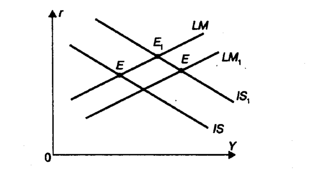 Теперь макроравновесие установилось в точке Е1 на пересечении кривых IS1 и LM.
