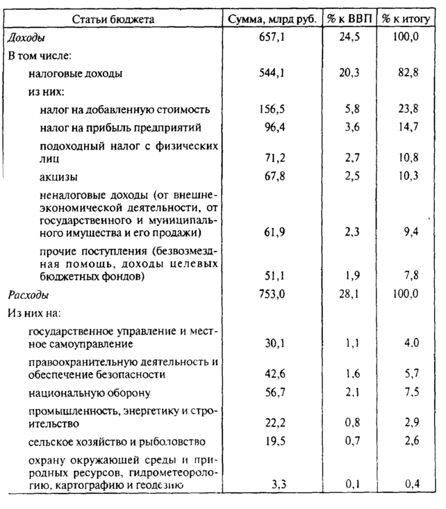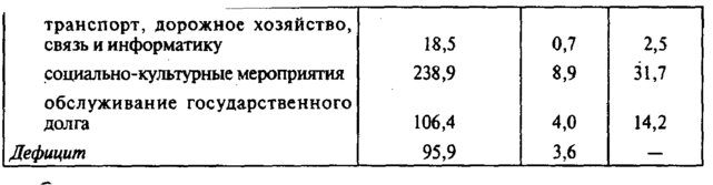Отметим, что учетом государственных внебюджетных фондов (а это еще около 9% по отношению к ВВП) доля социально-культурных мероприятий в расходах бюджета расширенного правительства резко возрастает — примерно до 18% всего российского ВВП.