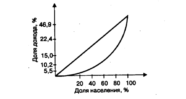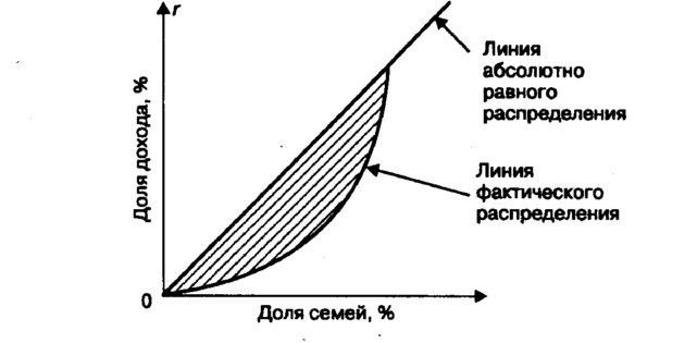Теоретическая возможность абсолютно равного распределения дохода представлена биссектрисой, которая указывает на то, что любой данный процент семей получает соответствующий процент дохода. Это значит, что если 20, 40, 60% семей получают соответственно 20, 40, 60% от всего дохода, то соответствующие точки будут расположены на биссектрисе. Кривая Лоренца представляет собой кумулятивное распределение численности населения и соответствующих этой численности доходов. В результате она показывает соотношение процентов всех доходов и процентов всех их получателей. Если бы доходы распределялись равномерно, т.е. 10% получателей имели бы десятую часть доходов, 50% — половину и т.д., то такое распределение имело бы вид л и н и и р а в н о м е р н о г о р а с п р е д е л е н и я. Неравномерное распределение характеризуется кривой Лоренца, т.е. л и н и е й ф а к т и ч е с к о го р а с п р е д е л е н и я, отстоящей от прямой тем дальше, чем больше дифференциация. Например, 20% населения с самыми низкими доходами получили 5% общего дохода, 40% с низкими доходами — 15%и т.д.