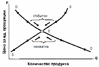 Закон рыночного равновесия утверждает, что цена любого товара изменяется, чтобы привести спрос и предложение товара в состояние равновесия.