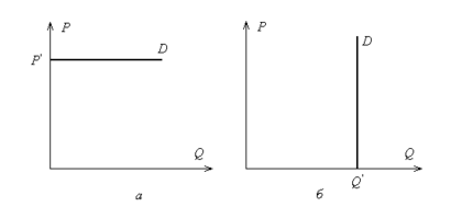 . Существует два крайних случая. Первый случай — существование только одной цены, при которой товар будет приобретаться покупателями. Любое изменение цены приведет либо к полному отказу от приобретения данного товара (если цена повысится), либо к неограниченному увеличению спроса (если цена снизится). При этом спрос является абсолютно эластичным, показатель эластичности бесконечен. Графически этот случай можно изобразить в виде прямой, параллельной горизонтальной оси (рис. а). Например, спрос на помидоры, продаваемые отдельным торговцем на городском рынке, абсолютно эластичен. Однако рыночный спрос на помидоры не является эластичным.