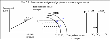 На рис.5.1.(а) кривая (тренд) отражает долгосрочную тенденцию увеличения реального ВВП. На рис.5.1.(б) экономический рост показан с помощью кривой производственных возможностей.