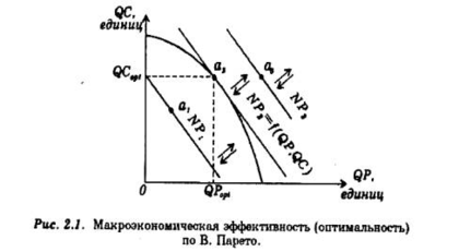 Первый уровень макроэкономической эффективности определяется критерием полноты (максимума) использования технологических возможностей народного хозяйства. Это означает отсутствие незадействованных в хозяйстве ресурсов (каждый ресурс находится в обороте и приносит выгоды его собственнику). Такую ситуацию выражает точка (а2), расположенная на КПВ. Точка (a1) выражает ситуацию недоиспользования ресурсов макроэкономики, например, в виде избыточных производственных мощностей, потерь в ходе экономического спада и в других отрицательных ситуациях. Точка (а3) показывает, что при нынешних технологических ограничениях уровень производства (NP3) достигнут быть не может. Но макроэкономика — структурно сложное образование. И она небезразлична к соотношению количества средств производства (QP) и предметов потребления (QC) в составе (NP). Если в текущем периоде требуется соотношение (QP) и (QC), задаваемое функцией NP = f(QP, QC) → max, то это значит, что критерий технологической эффективности должен быть дополнен критерием экономической эффективности (он выражает то обстоятельство, что необходимо добиться такой структуры производства национального продукта, которая обеспечивает, в свою очередь оптимум состояния потоков доходов и расходов). Таким образом, полнота использования ресурсов в макроэкономике должна дополняться развитием требуемой на данном историческом этапе структуры производства средств производства и предметов потребления: NP = QPоpt + QCopt.
