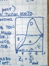 А – общий тип. Для всех признаков телосложения (скелетная система, мышечная, дыхательная, пищеварительная, жироотложение). Имеется два скачка (ускорения) – до адренархе и в период полового созревания.
