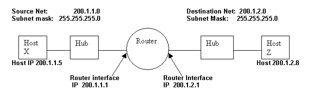 Explanation: This example will show how a Class C default subnet mask can be used to determine which network a host is on. A default subnet mask does not break an address into subnets. If the default subnet mask is used then the network is not being "subnetted". Host X (source) on network 200.1.1.0 has an IP address of 200.1.1.5 and wants to send a packet to host Z (destination) on network 200.1.2.0 and has an IP address of 200.1.2.8. All hosts on each network are connected to hubs or switches and then to a router. Remember that with a Class C network address ARIN (American Registry for Internet Numbers) assigns the first 3 octets (24 bits) as the network address so these are two different class C networks. This leaves one octet (8 bits) for hosts so each class C network could have up to 254 hosts (2^8 power = 256 – 2 = 254).