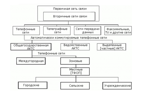Структура современной телефонной сети весьма избыточная и многоуровневая. На рисунке 2-31 показана структура телефонной сети России. На этом рисунке используются следующие обозначения: АКТС - автоматическая коммутируемая телефонная сеть; ТФОП - телефоны общего пользования.