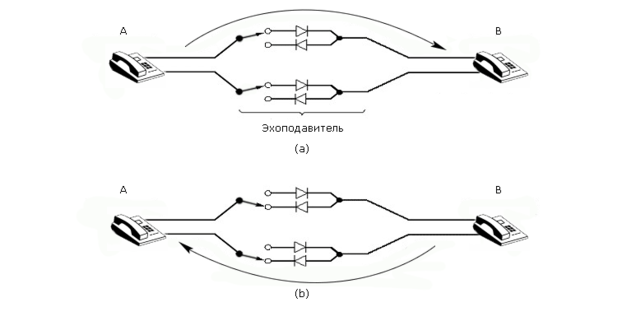 Другой важной проблемой при использовании телефонной линии является эхо. Причина этого явления проста - когда сигнал достигает приемника, часть его энергии отражается и возвращается к передатчику. При небольших расстояниях между приемником и передатчиком это практически незаметно. Когда расстояние велико, задержка между сигналом и эхом становится значительной. При телефонном разговоре вы наверняка сталкивались с эффектом эхо.